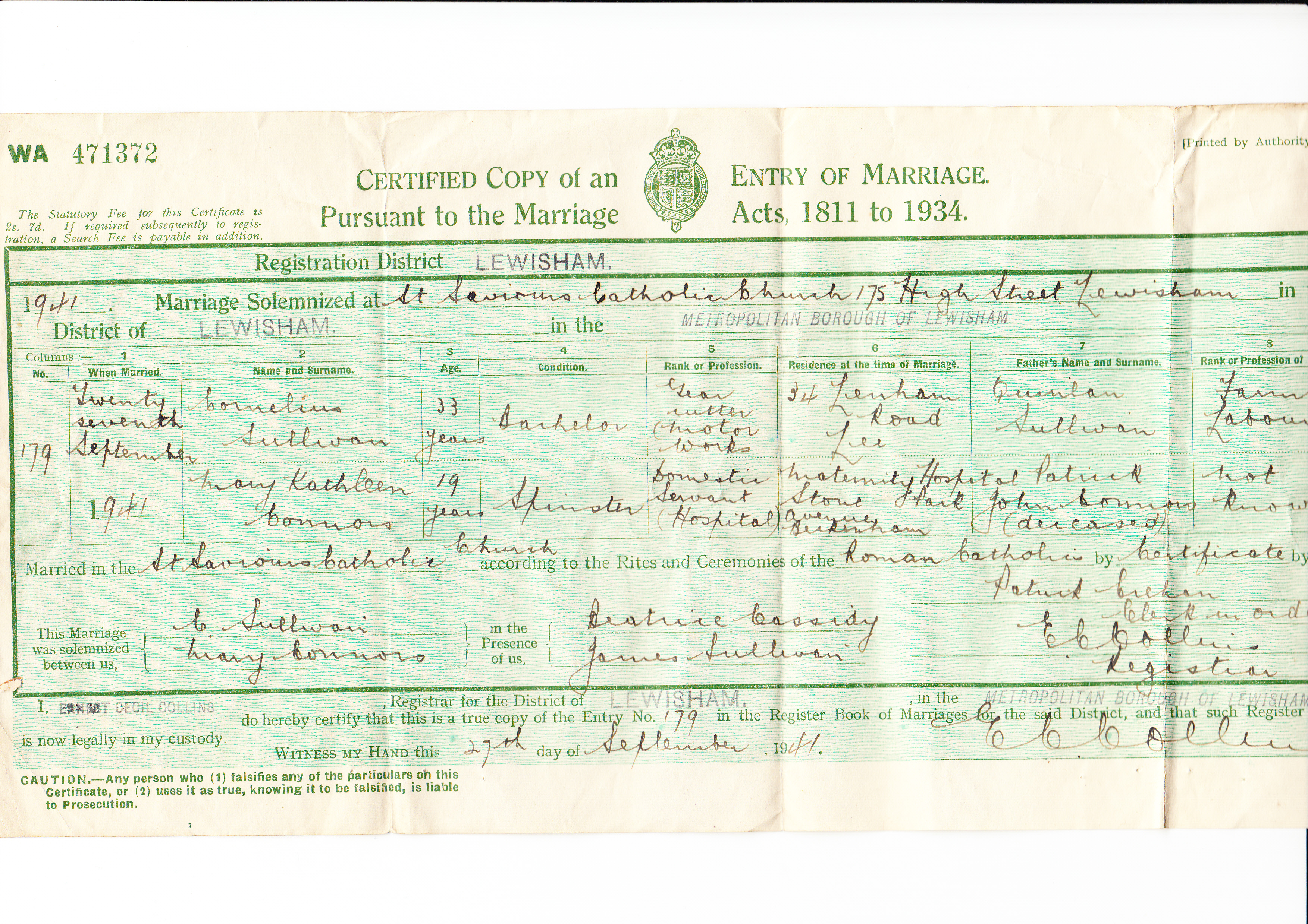 Residence at time of Marriage: 34 Lenham Rd, Lee