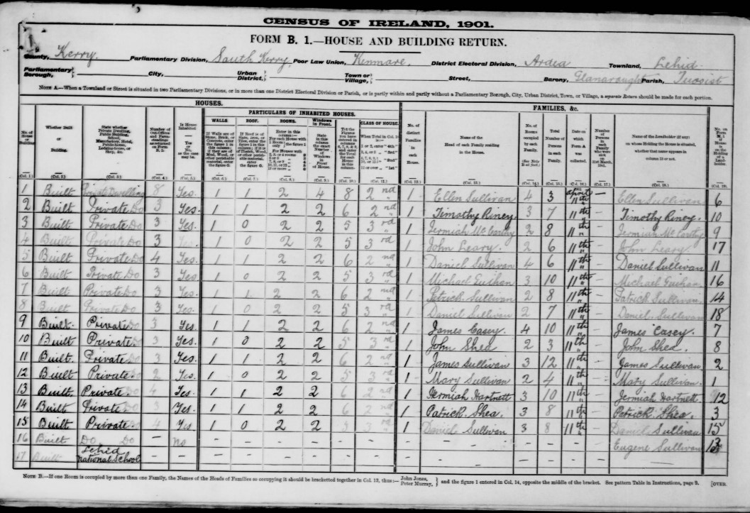 | Sullivan | Daniel | 30 | M | Head of Family | Catholic | Co Kerry | Farmer | Read and write | Irish and English | Married |