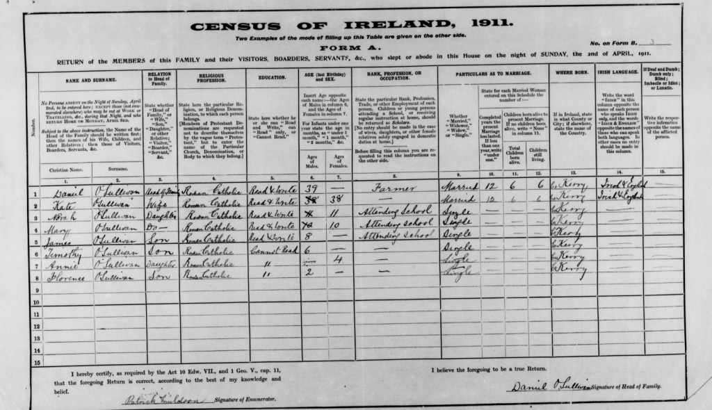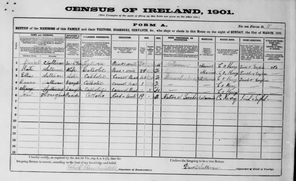 | O’Sullivan | Daniel | 39 | Male | Head of Family | Roman Catholic | Co Kerry | Farmer | Read and write | Irish and English | Married | – | 12 | 6 | 6 |
