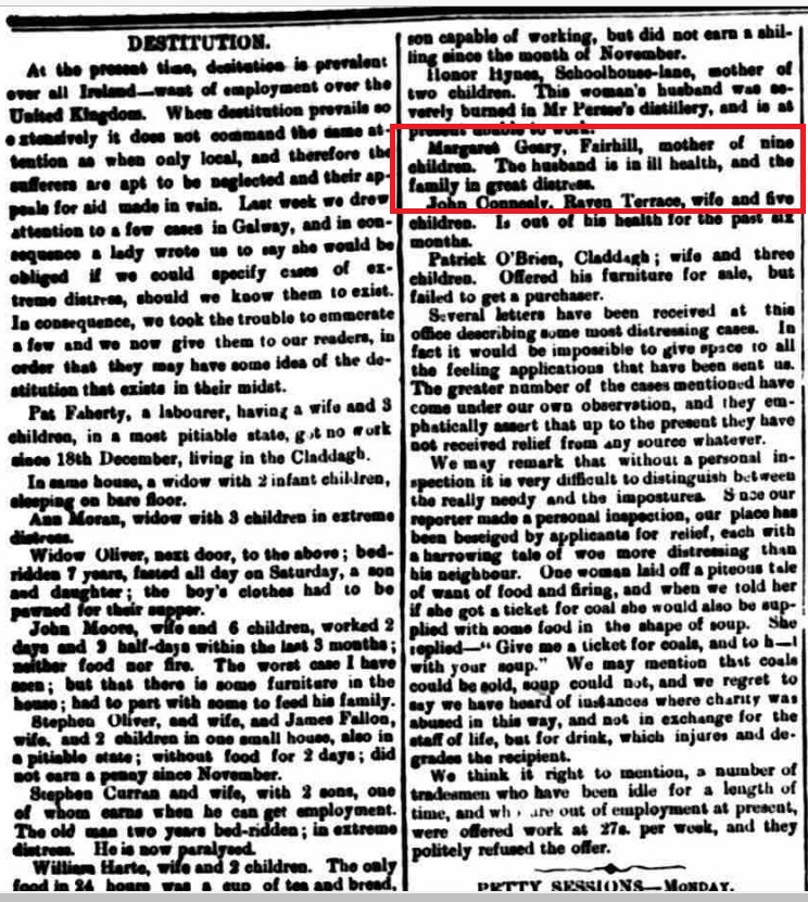 On Saturday 6th of February 1886, the Galway Express published an article about poverty in Galway. It included a reference to the Geary family in Fairhill.