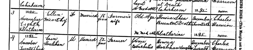 | Deaths registered in the District of: Kilcatherine In the Union of: Castletown No: 3 Date & Place of Death: November Eighth 1895, Kilcatherine Name & Surname: Ellen McCarthy Sex: F Condition: Married Age last Birthday: 72 years Rank, Profession or Occupation: Farmer’s wife Certified Cause of Death and Duration of Illness: Old age, no medical att. Signature, Qualification & Residence of Informant: Honoria Shea, present at death, Kilcatherine. When Registered: December Twentieth, 1895 Signature of Registrar: Charles Harrison |