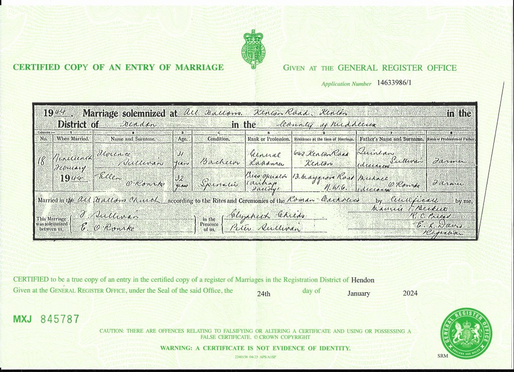 | Wife’s Father: | Michael O’Rourke (Deceased) |