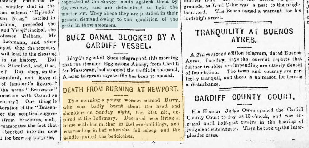 This morning a young woman named Barry, who was badly burnt about the head and shoulders on Sunday night, the 21st ult, expired at the Infirmary. Deceased was living at home with her mother in Reform-buildings, and was reading in bed when she fell asleep and the candle ignited the bedclothes. https://newspapers.library.wales/view/4232510/4232513/37/