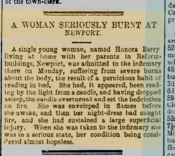 WOMAN SERIOUSLY BURNT AT NEWPORT. A single young woman, named Honora Barry living at homeme with her parents in Reform- buildings, Newport, was admitted to the infirmary there on Monday, suffering from severe burns about the body, the result of a pernicious habit of reading in bed. She had, it appeared, been reading by the light from a candle, and having dropped asleep,the candle overturned and set the bedclothes on fire. She was enveloped in flames before she awoke, and then her night-dress had caught fire, and she had sustained a large superficial injury. When she was taken to the infirmary she was in a serious state, her condition being considered almost hopeless. https://newspapers.library.wales/view/4322016/4322023/132/