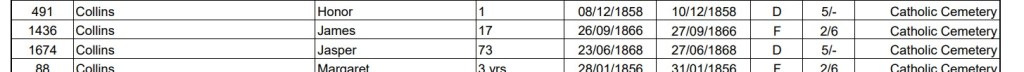| 1436 | Collins | James | 17 | 26/09/1866 | 27/09/1866 | F* | 2/6* | Catholic Cemetery |