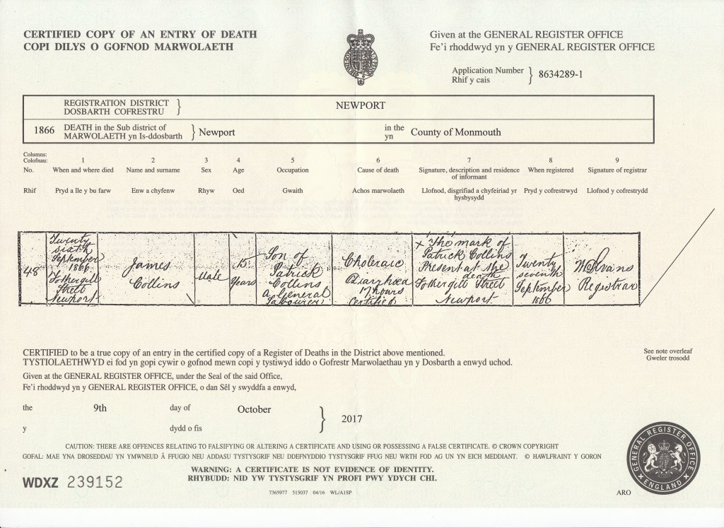James Collins was born on the 9th of May 18511 in Newport. He lived in Fothergill Street. He died from Cholera on 27th of September 18662,3,4.