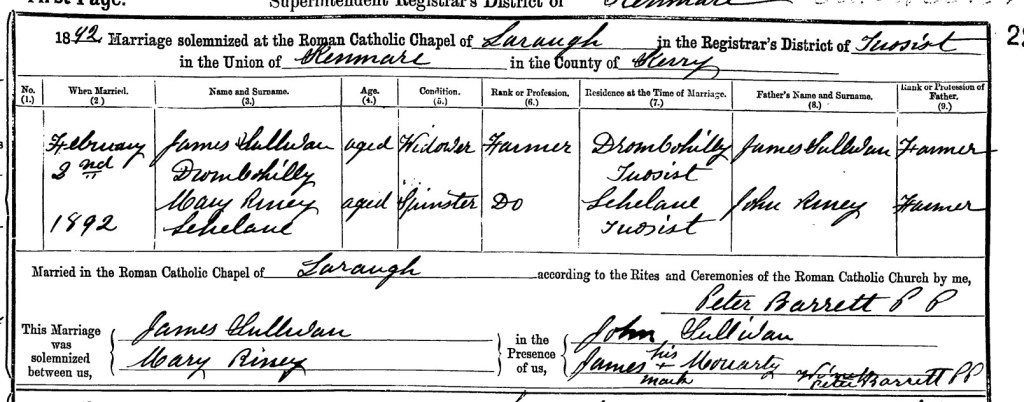 Marriage certificate of James Sullivan and Mary Riney, 2 February 1892