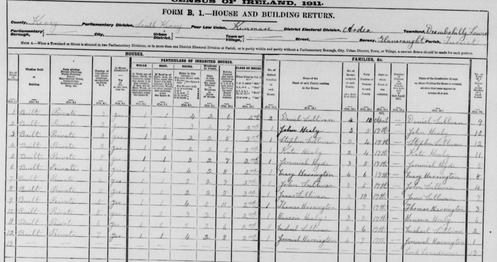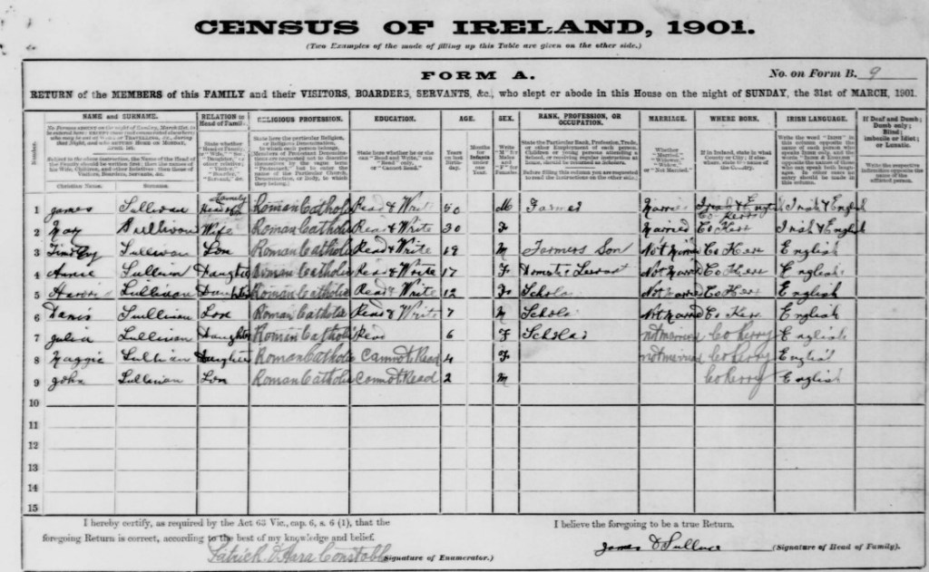 | Sullivan | James | 62 | Male | Head of Family | Roman Catholic | Co Kerry | Farmer | Read and write | Irish and English | Married | – | – | – |