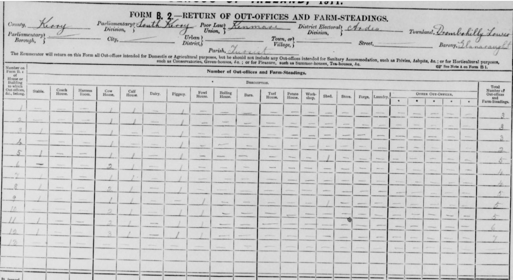 The additional forms tell us that the house was built of stone and had a thatched roof. The family of 10 lived in two rooms. There was a stable, two cow houses, a calf house and a piggery.
