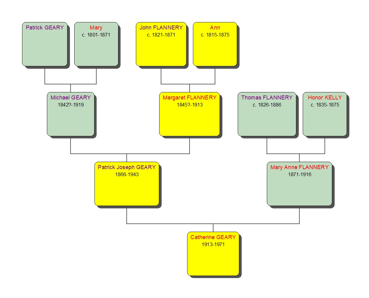 Click on the branch to see information about John & Ann’s daughter, Margaret. The diagram below shows the tree to their great-granddaughter, Catherine Geary.
