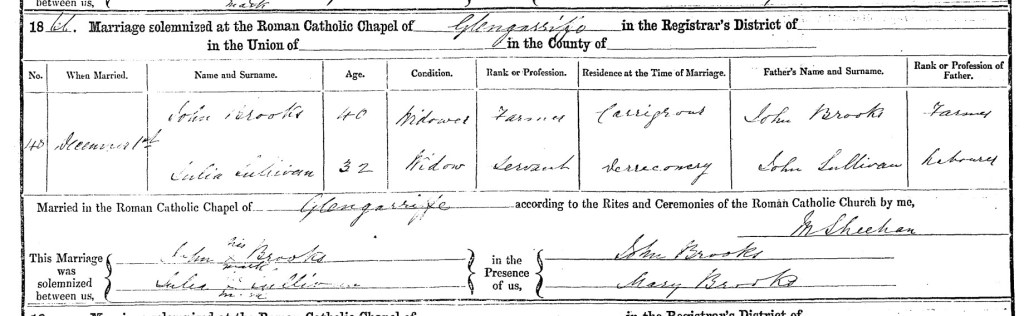 There is a record of John Brooks’ marriage to Julia Sullivan in December 1866. The certificate provides evidence of their ages and indicates that both had previously been married and widowed.
