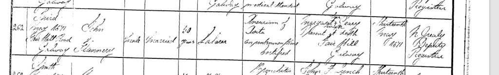| Signature, Qualification & Residence of Informant: | Margaret Geary, present at death, Fair Hill, Galway |