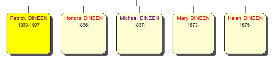 John M DINEEN was born around 1840. His father, Michael Dineen, was a farmer but it is not possible to identify who this was. John was also a farmer. He died on 23 Dec 1903 in Incheese, Kilgarvan, Kerry, Ireland.