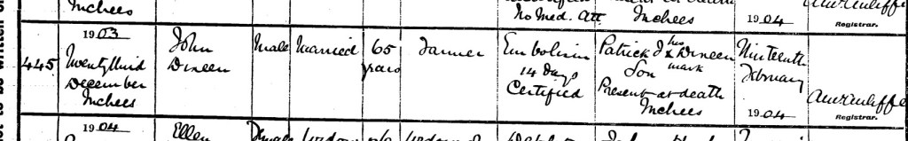 | Signature, Qualification & Residence of Informant: | Patrick J Dineen (his mark), Son, Present at death, Incheese |