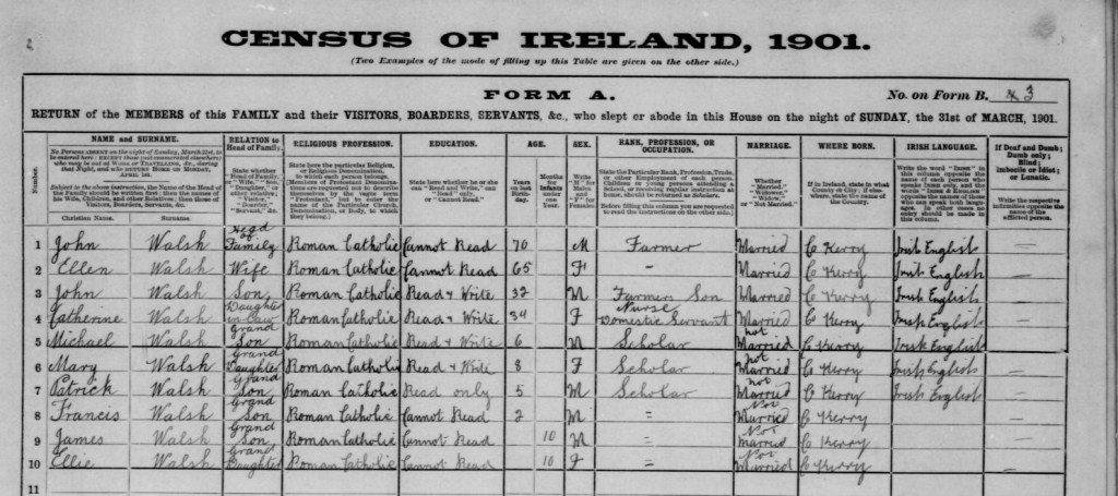 | Walsh | John | 70 | Male | Head of Family | Roman Catholic | Co Kerry | Farmer | Cannot read | Irish English | Married |