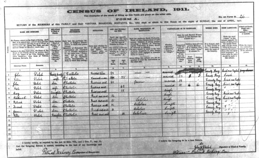 | Frank Walsh | Son “ | Male | 12 | Single | Scholar | Read & Write | County Kerry | English | |||