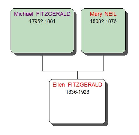 Ellen FITZGERALD was born on 29 May 1836 in Lisnakealwee. There are no records available for her birth or the names of her parents. She died on 21 Feb 1928 in Lisnakealwee.