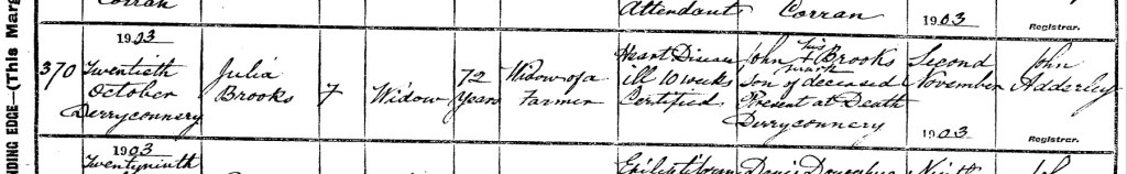 | Signature, Qualification & Residence of Informant: | John Brooks (his mark), son of deceased, present at death, Derryconnery |