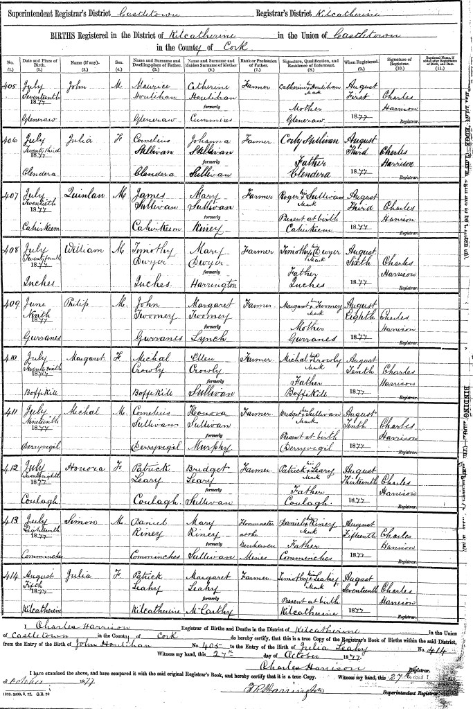 Julia’s birth was registered on August 17th 1877 by Timothy Leahy. This may have been her grandfather. The date of birth is recorded as the August 5th. However, her baptism took place on July 26th when her birth was given as July 20th.