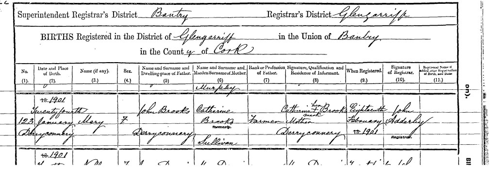 Baptism of MARY BROOKS of DERRYCONNERY on 2 December 1900, Area – KERRY (RC), Parish/Church/Congregation – GLENGARRIFF