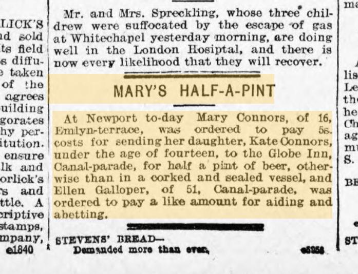 “At Newport to-day Mary Connors, of 16, Emlyn terrace, was ordered to pay 5S. costs for sending her daughter, Kate Connors, under the age of fourteen, to the Globe Inn, Canal-parade, for half a pint of beer, other-wise than in a corked and sealed vessel, and Ellen Galloper, of 51, Canal-parade, was ordered to pay a like amount for aiding and abetting.”