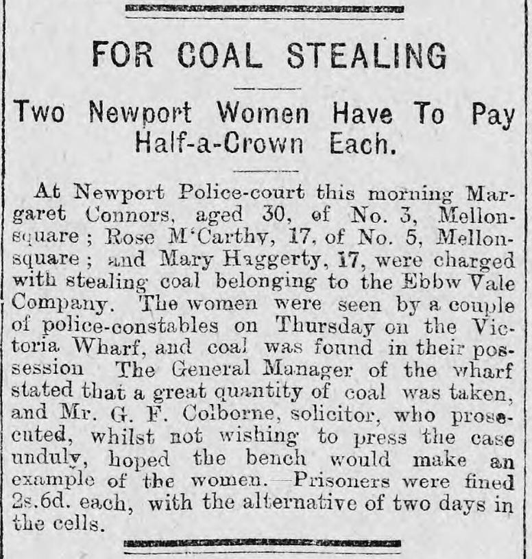 “At Newport Police-court this morning- Margaret Connors, aged 30, of No. 3, Mellon- square Rose McCarthy, 17, of No. 5, Mellon- square and Mary Haggerty, 17, were charged with stealing coal belonging to the Ebbw Vale Company. The women were seen by a. couple of police-constables on Thursday on the Victoria Wharf, and coal was found in their possession The General Manager of the wharf stated that a great quantity of coal was taken, and Mr. G. F. Colborne, solicitor, who prosecuted, whilst not wishing to press the case unduly, hoped the bench would make an example of the women. Prisoners were fined 2s.6d. each, with the alternative of two days in the cells.”