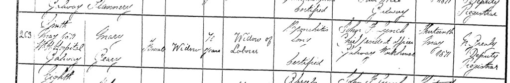 | Date & Place of Death: | Eighth May 1871, Galway W.H. Hospital |