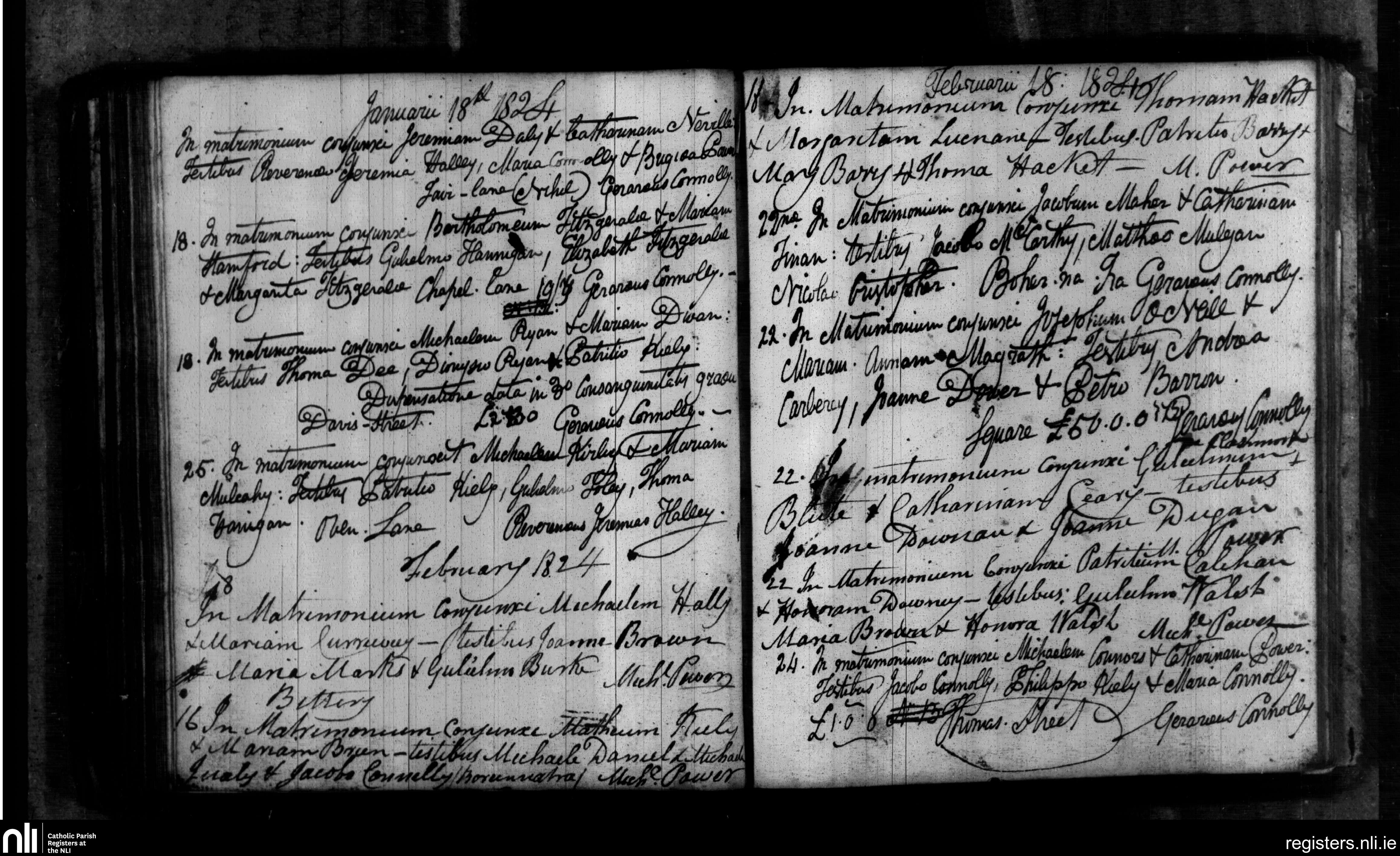 Images from the Dungarvan parish records for 1824 are available online, although they are not yet transcribed or indexed. At the bottom right of the image below, there is a marriage for Michael Connors. Translated, it reads: