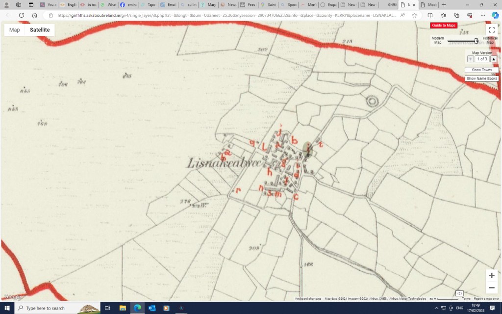 Below (1) is the Griffifths Valuation Map from 1852. The map reference shown against Michael Fitzgerald, 1i, has bee highlighted. The second image is the Griffiths map overlaid against a modern satellite picture.
