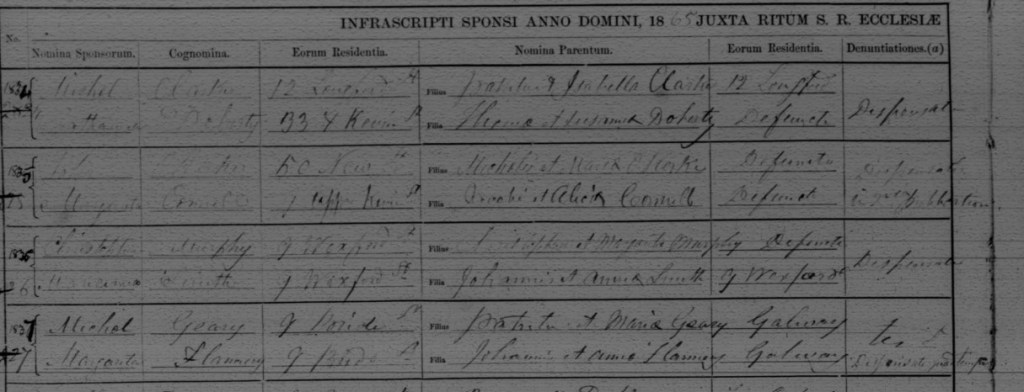 The church record additionally gives the names and addresses of the bride and groom’s parents, showing that they are from Galway.