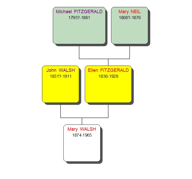Mary WALSH was born on 26 Jul 1874 in Teer, Co Kerry, Ireland. She died on 21 Jun 1965 in Lisnakealwee.