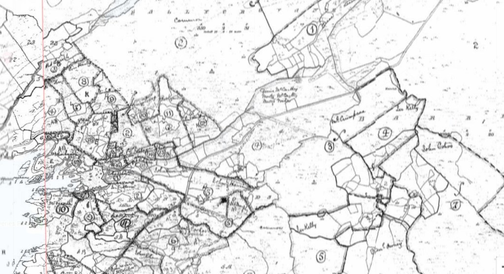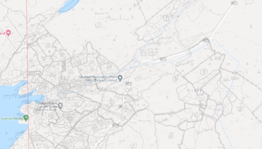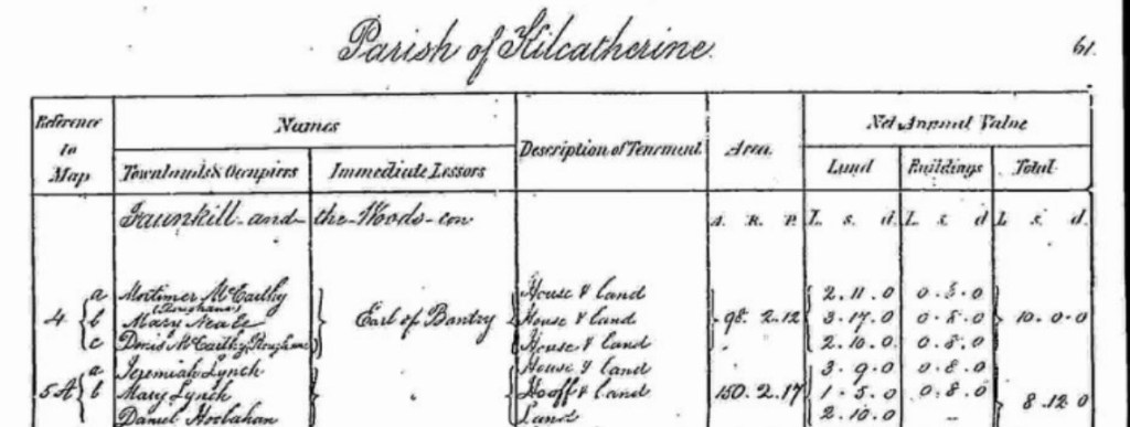 Mort McCarthy has an entry in the Griffiths Valuation for Kilcatherine. He is shown as being a tenant in Faunkill in the Woods at Map reference 4 where he shares 98 acres with two others. His share of this acreage is valued at £2-11s. (£2.55 in decimal currency). He is additionally assessed for 8 shillings (£0.40p for ‘House, Office, Land’) which would include farm buildings.