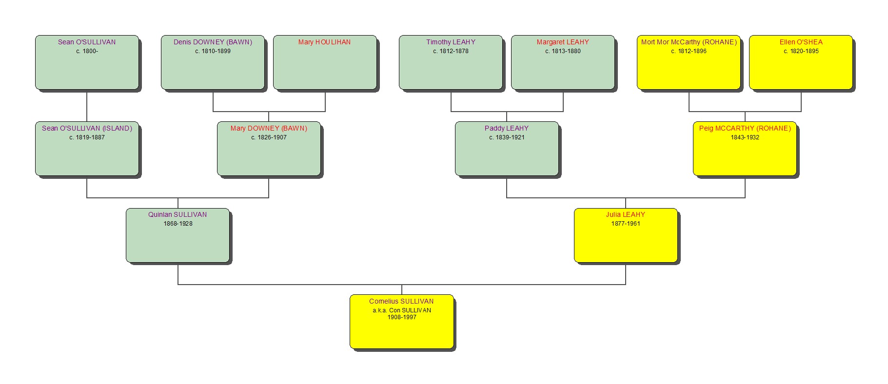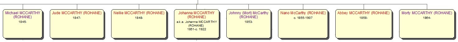 Click on the branch to see information on Peig McCarthy. The diagram below shows the tree to their great-grandson, Con Sullivan.