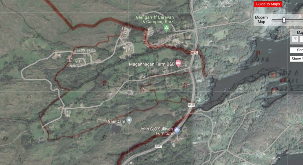 The first image shows that Mortimer Sullivan is assessed for Two Shillings rent for his house and land in Derryconnery at Map Reference 2. The second image shows the Griffiths map where the number 2 can be seen in red. The next image shows this map overlaid against a current map.