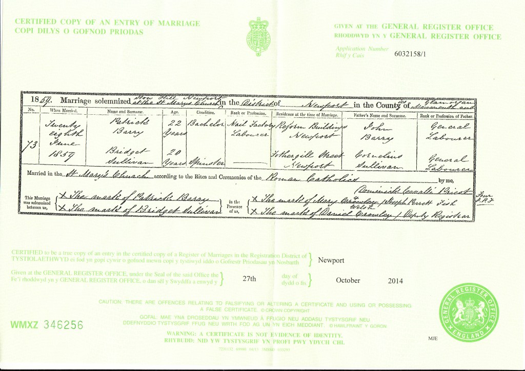 | Married in St Mary’s Church according to the rites and ceremonies of the Roman Catholics by me Dominic Cavalli, Priest |