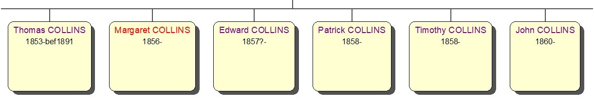 Click on the highlighted branches to see information about Patrick & Johanna’s children. The diagram below shows the tree to their great-granddaughter, Mary Connors.