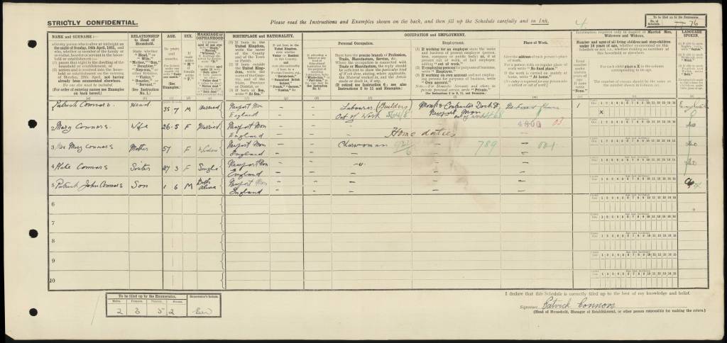 In 1921, Patrick is living with his wife, mother and sister and their first child Paddy. Patrick is out of work at this point.