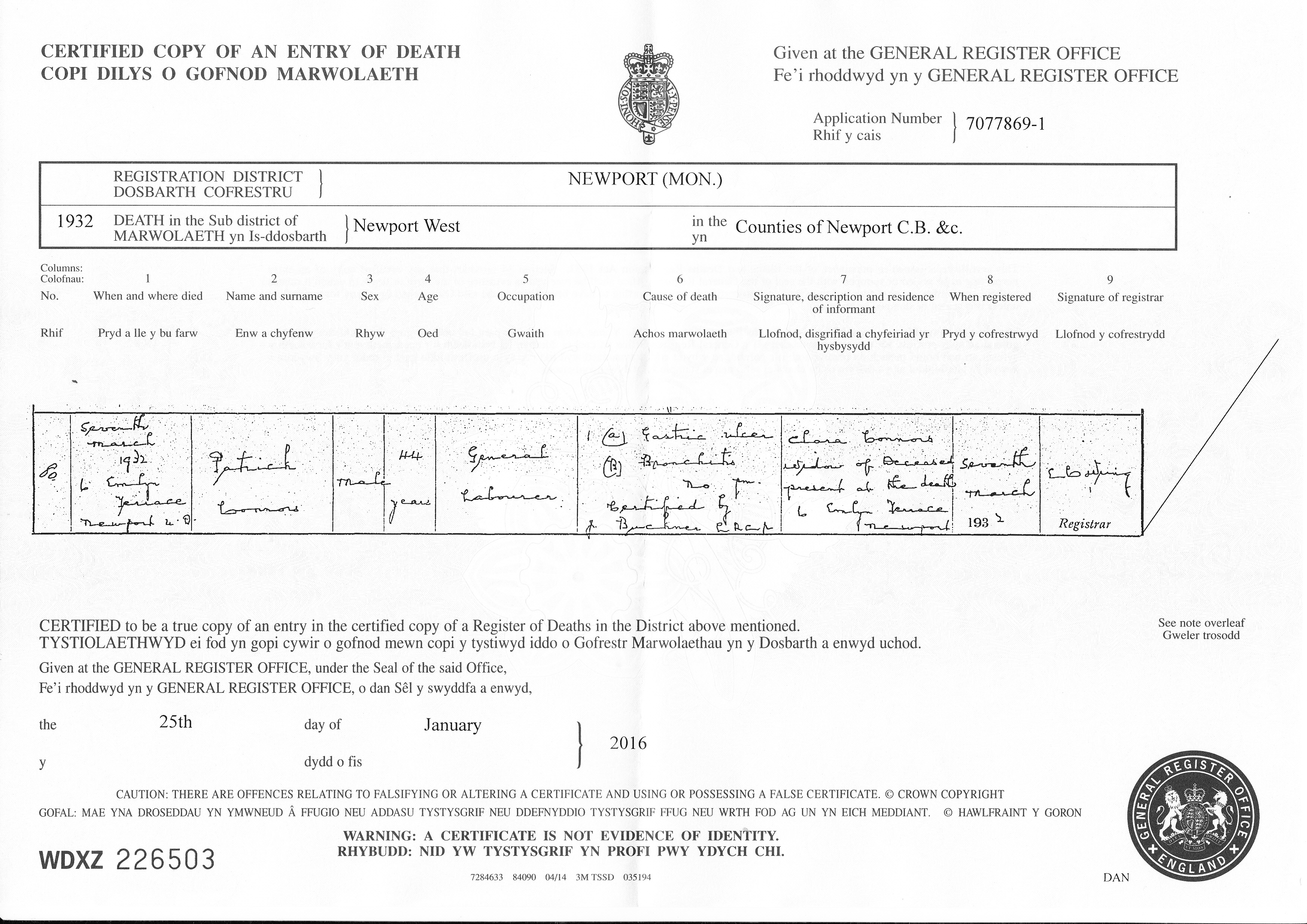 Signature, description and residence of informant: Clara Connors, widow of deceased, present at the death, 6 Emlyn Terrace, Newport