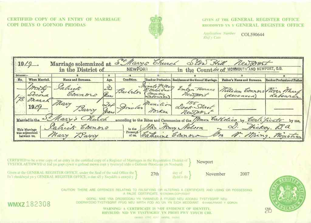 | Residence at time of Marriage: 155 Dock Street, Newport |