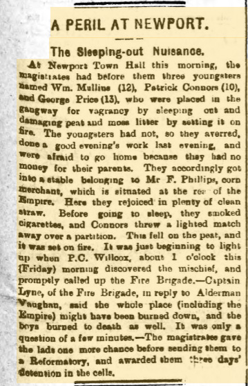 At Newport Town Hall this morning, the magistrates had before them three youngsters named Wm. Mullins (12), Patrick Connors (10), and George Price (13), who were placed in the gangway for vagrancy by sleeping out and damaging peat and moss litter by setting it on fire. The youngsters had not, so they averred, done a good evening’s work last evening, and were afraid to go home because they had no money for their parents. They accordingly got into a stable belonging to Mr F. Phillips, corn merchant, which is situated at the rear of the Empire. Here they rejoiced in plenty of clean straw. Before going to sleep, they smoked cigarettes, and Connors threw a lighted match away over a partition. This fell on the peat, and it was set on fire. It was just beginning to light up when P.C. Willcox, about 1 o’clock this (Friday) morning discovered the mischief, and promptly called up the Fire Brigade. Captain Lyne, of the Fire Brigade, in reply to Alderman Vaughan, said the whole place (including the Empire) might have been burned down. and the boys burned to death as well. It was only a question of a few minutes.—The magistrates gave the lads one more chance before sending them to a Reformatory, and awarded them three days’ detention in the cells.