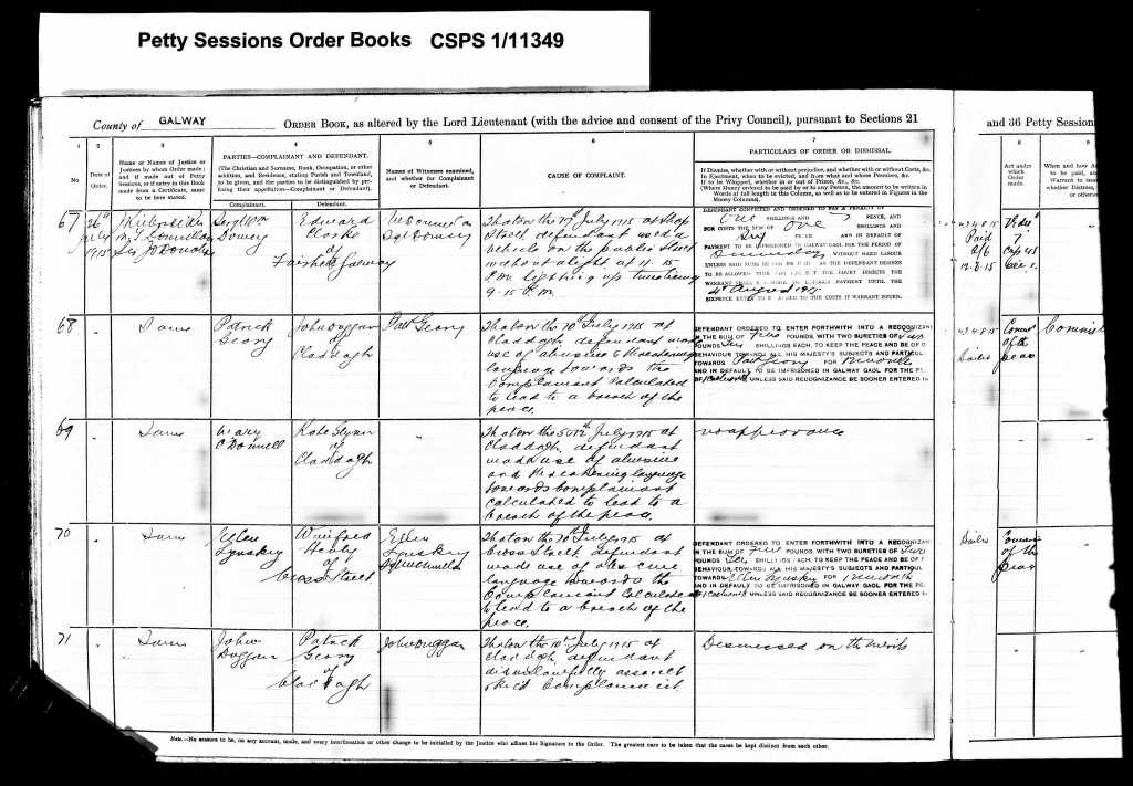 | Cause of Complaint: | That on the Tenth of July, 1915, at Claddagh, defendant made use of abusive and threatening language towards the complainant, calculated to lead to a breach of the peace. |