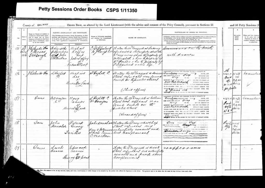 | Particulars of Order or Dismissal: | Defendant convicted and ordered to pay a penalty of Ten Shillings and for costs the sum of Ten Shillings and in default of payment to be imprisoned in Galway Gaol for the period of Fourteen days without hard labour unless said sum is sooner paid. Paid 20 shillings and six pence. |