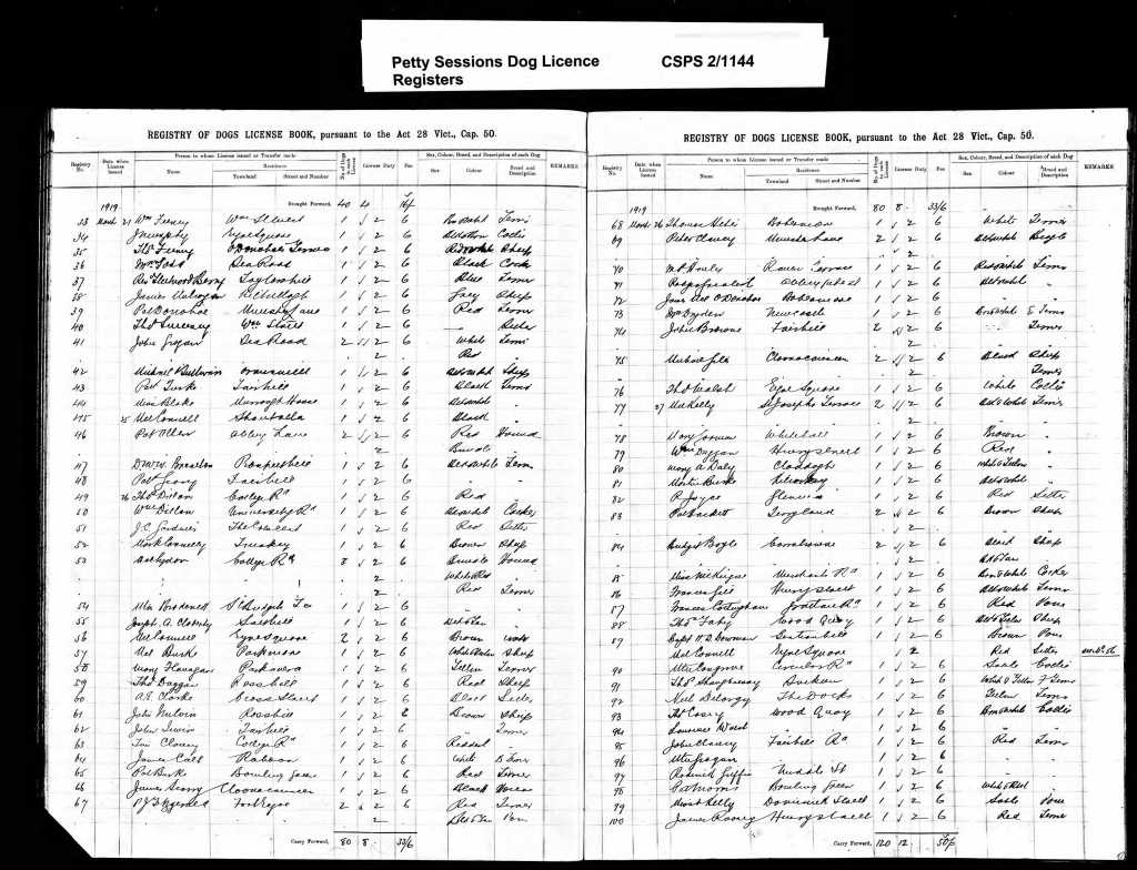 Source: The National Archives of Ireland; Dublin, Ireland; Ireland Dog Licence Registrations; Reference #: CSPS 1/1141-1145