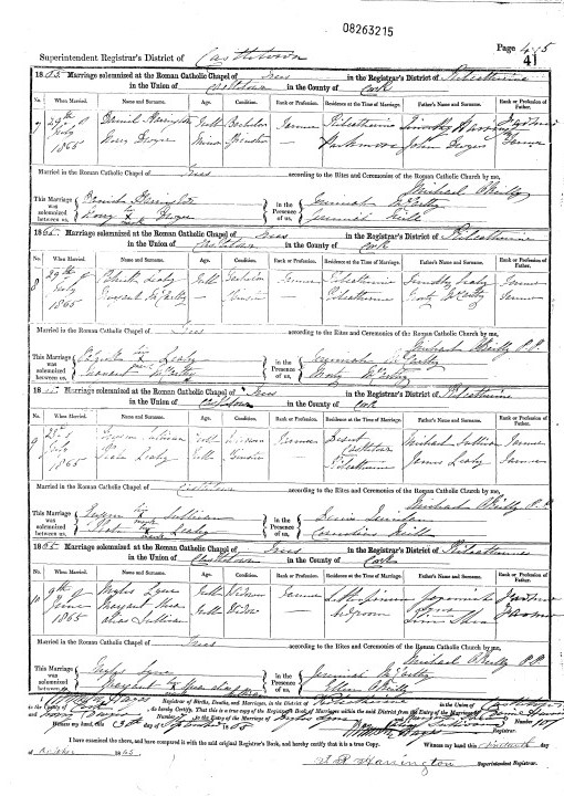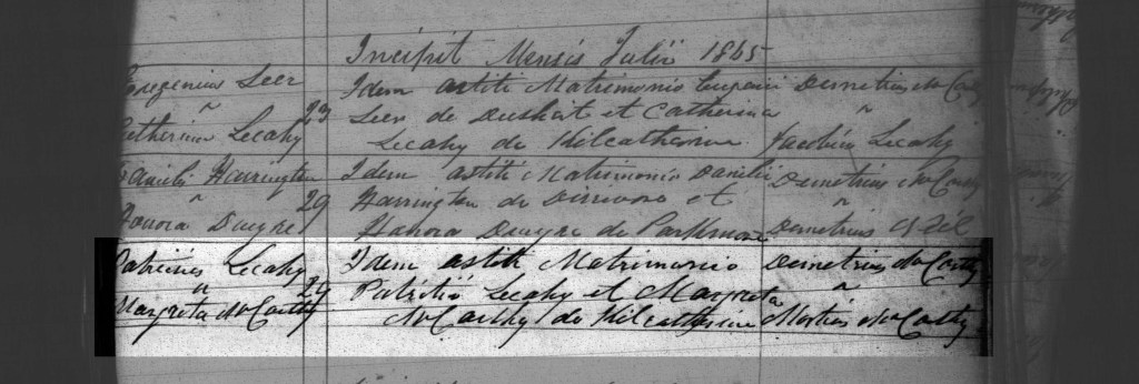 Paddy Leahy & Peig McCarthy (Rohane) were married on July 29, 1865 in Eyeries Parish church. The marriage register has been transcribed and a microfilm image also exists. There is also a civil marriage record, which includes the names of the bride & groom’s fathers.