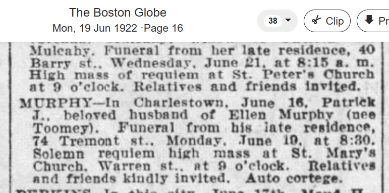 Patrick Murphy’s obituary appeared in the Boston Globe on 19 June 1922