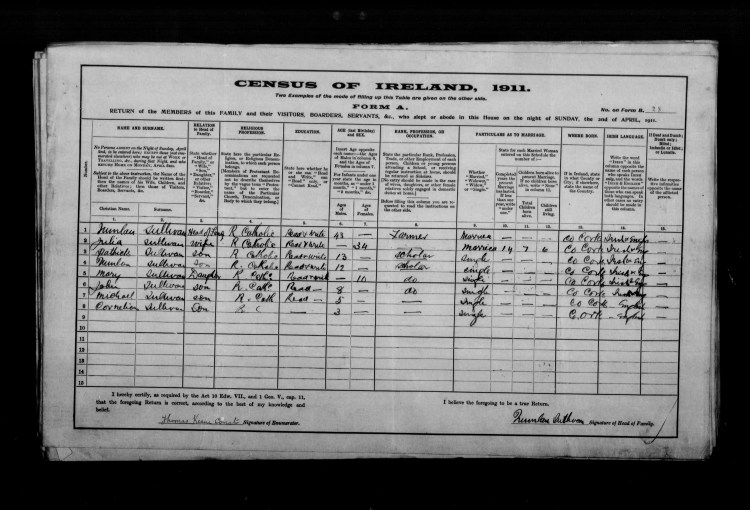 Patrick Sullivan 1911 Census Click on the image to see in full-screen Patrick is now 13 and can read and write. He may or may not still be at school. Census enumerators often wrote ‘scholar’ as a matter of course. The census records that Patrick speaks Irish and English.