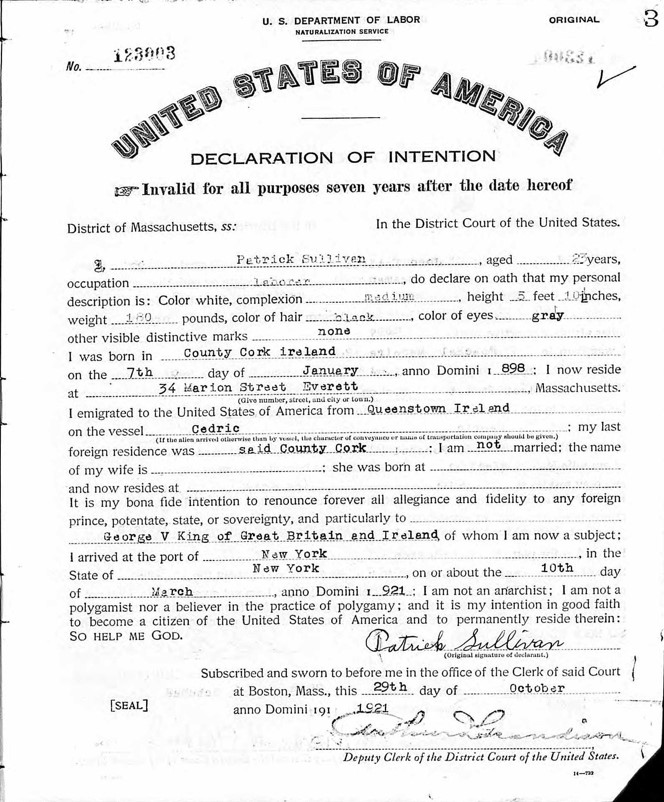 In 1921, the year he arrived in the US, Patrick declared his intention to become a US Citizen. By the time of the 1930 Census, he was a naturalised citizen.
