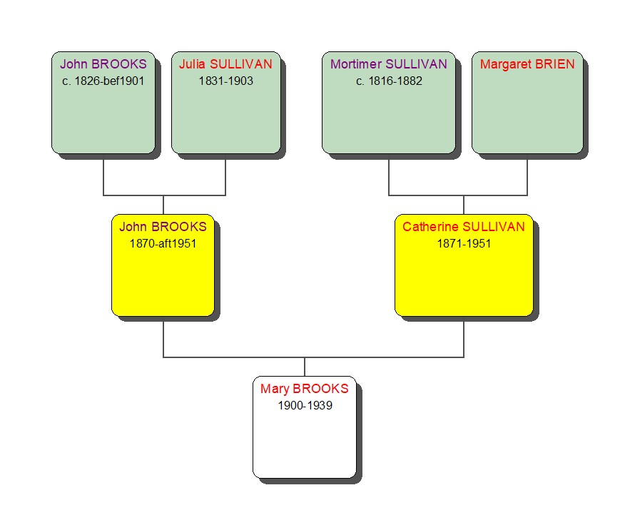 Mary BROOKS was born on 1 December 1900 in Derryconnery, Cork and baptised in Glengarriff on the following day. She travelled to the USA in 1925. She died on 2 October 1939 in Glengarriff, Cork, Ireland.
