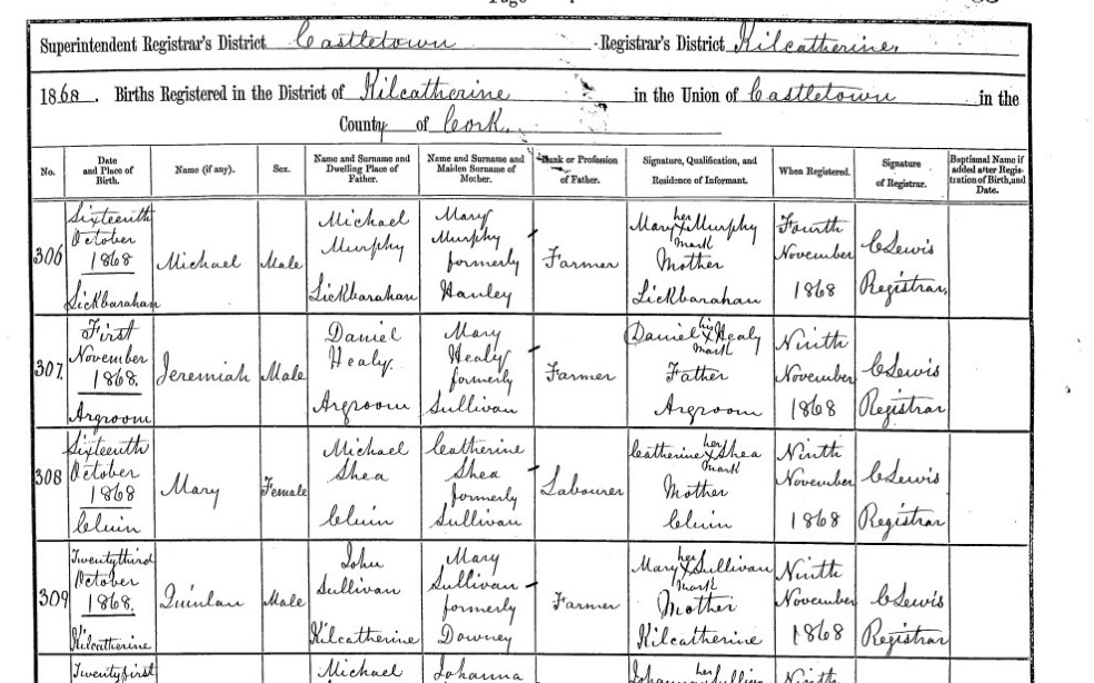 Name, Surname & Dwelling Place of father: John Sullivan, Kilcatherine