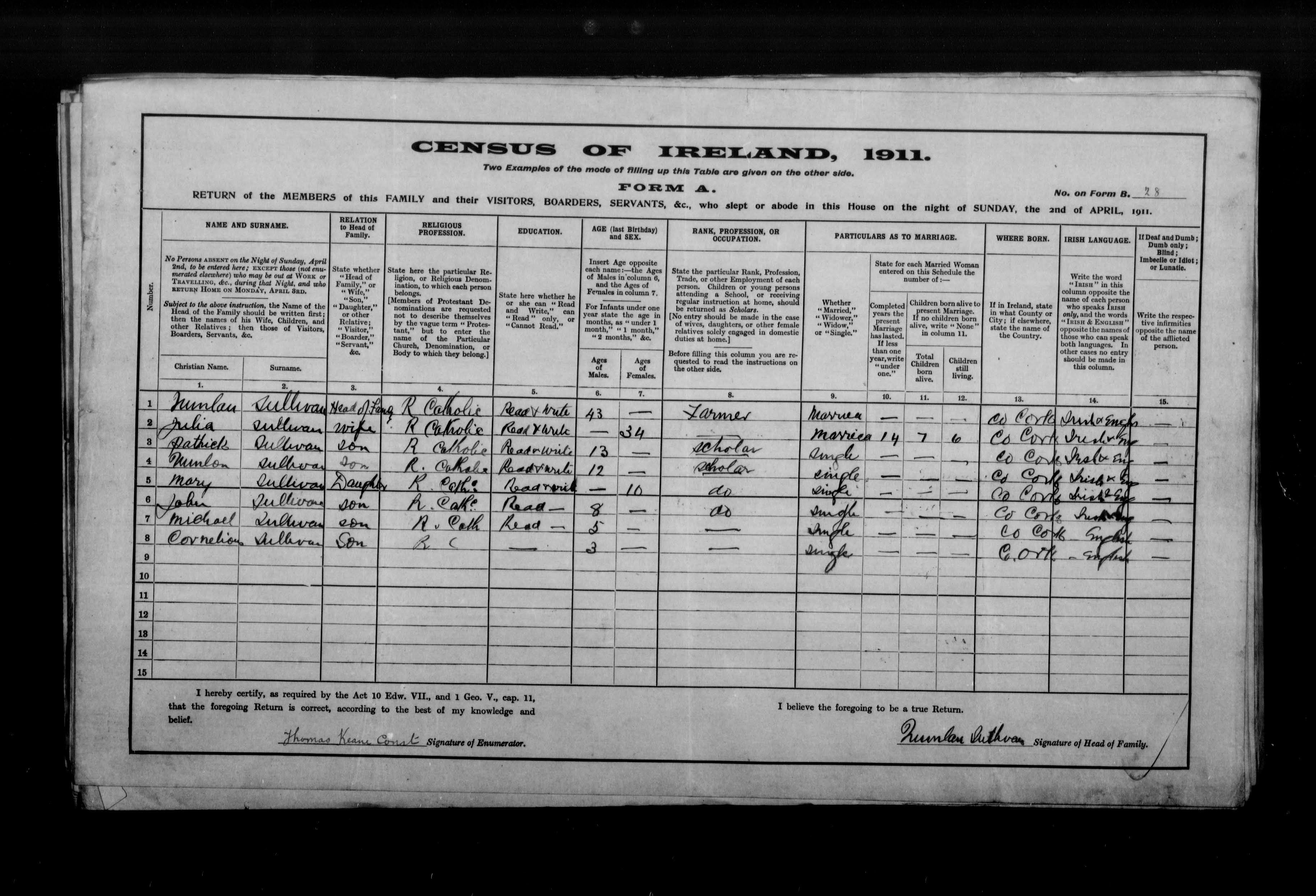 | Sullivan | Julia | 34 | Female | Wife | Roman Catholic | Co Cork | Housewife | Read and write | Irish and English | Married | 14 | 7 | 6 |